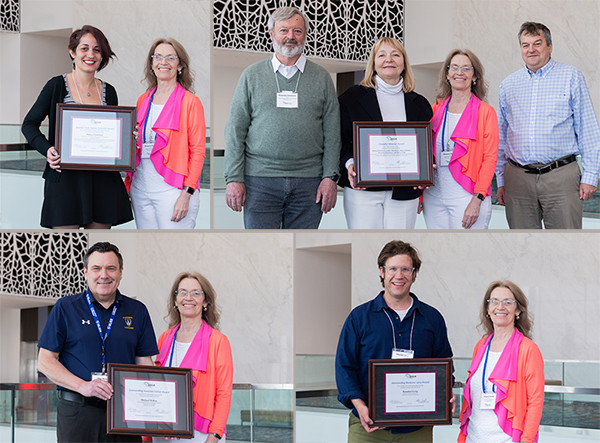 Award winners are pictured with JGLR Editor Margaret Docker. Top left: Bianca Possamai, recipient of the Elsevier Early Career Scientist Award. Top right: Chandler-Misener Award winners Alexander Karatayev, Lyubov Burlakova, and James Watkins (not pictured: lead author Richard Bariero and co-author Barry Lesht.) Bottom left: Mike Mckay, Oustanding Associate Editor, and right, Brandon Gerig, Outstanding Reviewer Award recipient.